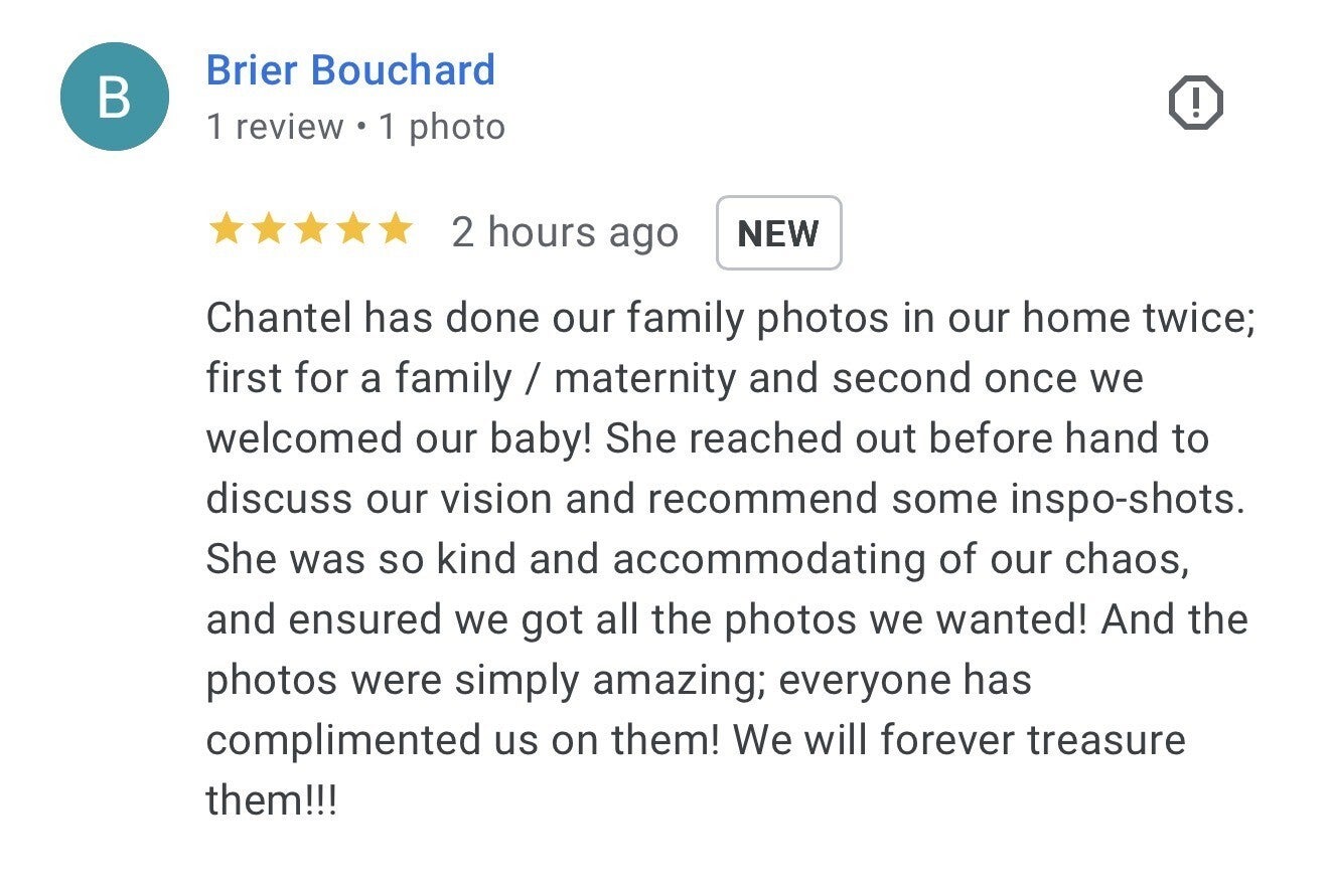 Chantel was an absolute dream to work with! I find it always a bit awkward getting pictures done but she made it so smooth and told us exactly what to do, while making it fun! My husband even said how much he enjoyed the session and how relaxing it was! Chantel as a person is so warm and sweet and builds you up so you feel your absolute BEST! Side note she is AMAZING with kids as well, my daughter loves her and couldn't stop smiling at her!